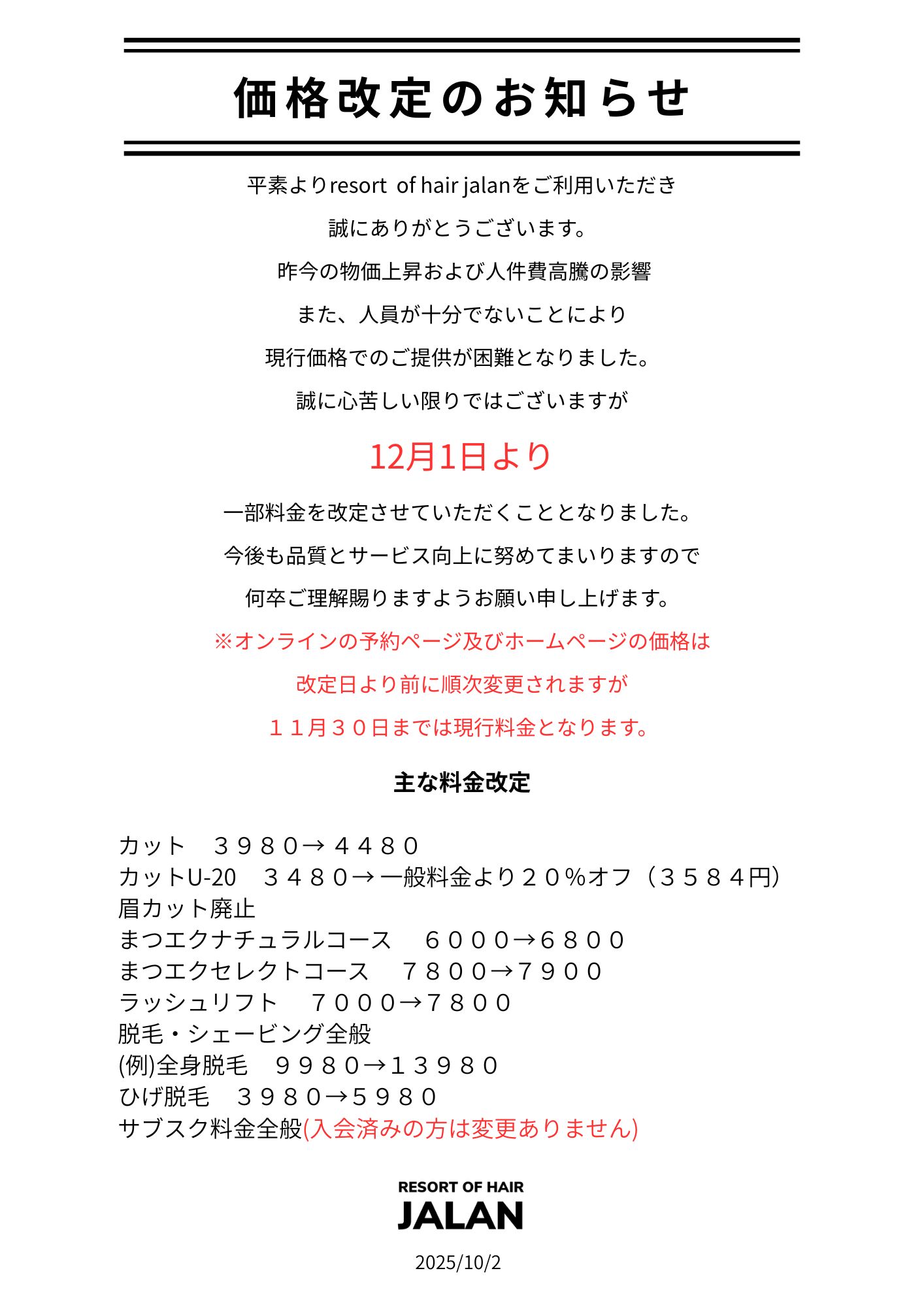 価格改定のお知らせ